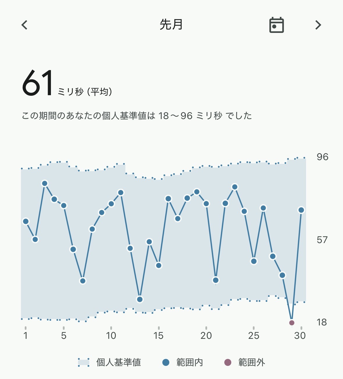 私の場合、お酒を飲めば飲むほど、心拍変動が低くなります。また、仕事のコンディションが良い時ほど心拍変動が高いことが多いので、自分自身の自律神経・コディションの状態を把握するために見ています。
