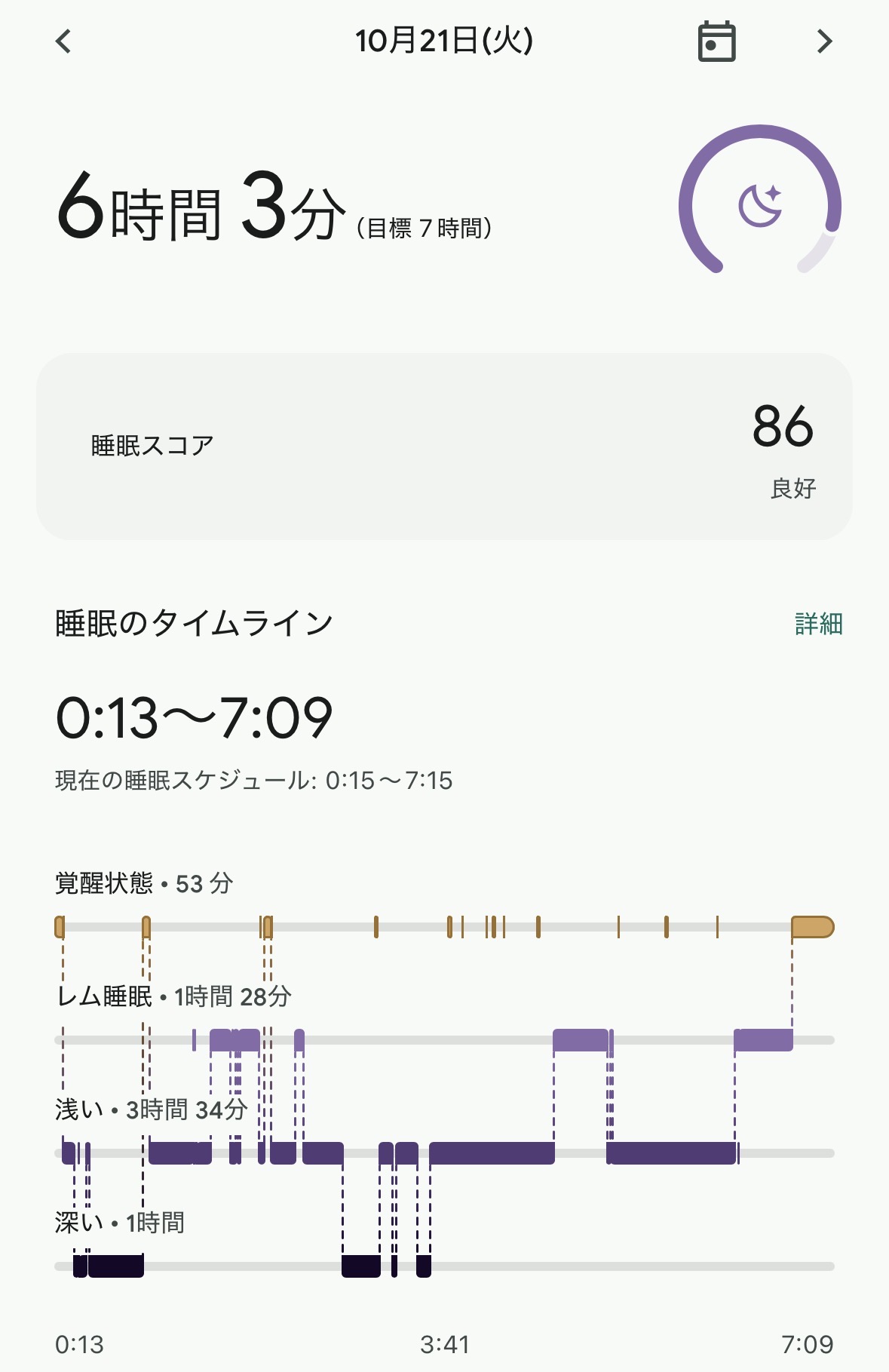 睡眠レポートでは睡眠時間と共に、睡眠の質として「ノンレム睡眠での深い睡眠」と「レム睡眠」の時間・比率をよく見ています。