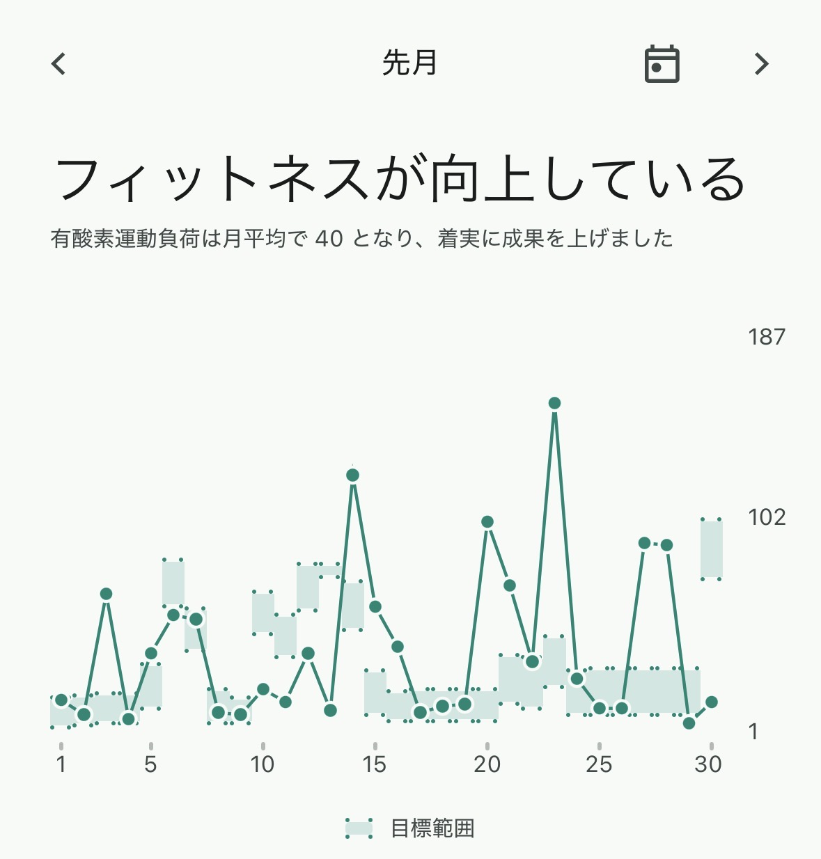 この中で、有酸素運動負荷以外の4つは睡眠時にFitbitを着用していないとレポートが出てきませんので、こうした点からもバッテリーの持ちと軽さに特徴のあるFitbitは良いなと感じています。